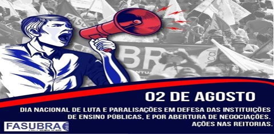 A FASUBRA Sindical convoca todos as entidades sindicais filiadas representantes dos trabalhadores técnico-administrativos em educação a paralisar as atividades no Dia Nacional de Luta em defesa das instituições de ensino públicas, e por abertura de negociações, 02 de agosto. Também será desenvolvida pressão sobre os parlamentares nos aeroportos em 01 de agosto, como parte do processo de pressão e de construção de manifestações que se desenvolverão em 02 de agosto.