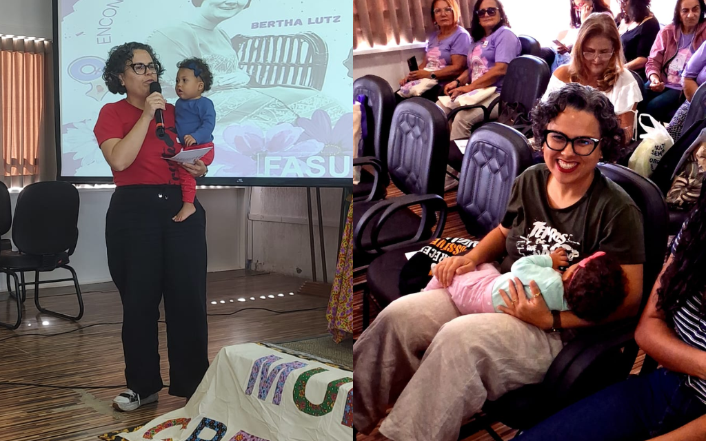 “Foi ótimo ela estar numa sala pertinho do auditório. Assim, ela teve suas necessidades de cuidado e alimentação atendidas. Mas, também pôde vivenciar um pouquinho o evento, ter contato com tantas mulheres maravilhosas. Em alguns momentos, ela foi para a plenária comigo, eu cheguei a fazer uma intervenção com ela no colo, mas a cuidadora estava ali pertinho e foi muito importante. Porque eu não precisava ficar me dividindo demais entre ela e o evento. Tinha alguém para tomar conta dela, e aí eu pude aproveitar melhor os debates”, salientou Lara.